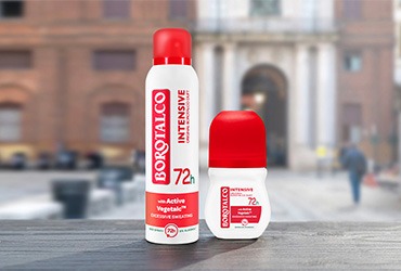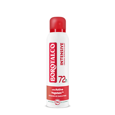 Entdecke das Borotalco-Erlebnis mit Borotalco Intensive! Die hochwirksame Formel, angereichert mit dem innovativen Active VegetalcTM, einer Mischung aus absorbierenden Pudern pflanzlichen Ursprungs, bietet einen dreifachen Deo-Schutz gegen übermäßiges Schwitzen: Es schützt, absorbiert und neutralisiert Schweiß, auch wenn das Leben einmal intensiver wird!
