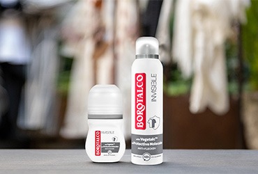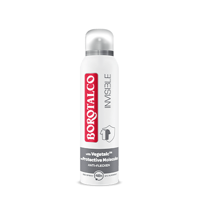 Entdecke das Borotalco-Erlebnis mit Borotalco Invisible! Die Formulierung, angereichert mit dem innovativen VegetalcTM, einer Mischung aus absorbierenden Pudern pflanzlichen Ursprungs, und Protective Molecules: Ein Netz unsichtbarer Moleküle beugt der Übertragung von Gerüchen, Schweiß und Verfärbungen auf Kleidung vor.