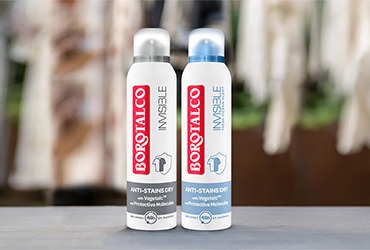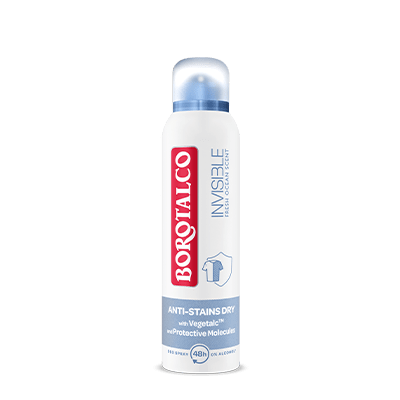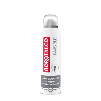 Prigrlite Borotalco iskustvo uz Borotalco Invisible! Njegova formula je obogaćena inovativnim VegetalcTM-om, mešavinom upijajućih prahova biljnog porekla i zaštitnim molekulima: mrežom nevidljivih molekula koja skuplja i ne širii tragove od znoja ispod pazuha, neprijatne mirise i mrlje, stvarajući efekat barijere između kože, odeće uz osećaj suvoće. Deluje na bele i žute mrlje, čak i na delikatnim tkaninama, kao što je svila.